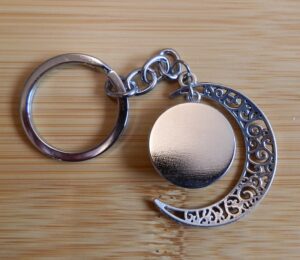 Porte-clés portrait d’un âne dessiné dans une bulle en verre entouré d’une lune en métal ajouré.